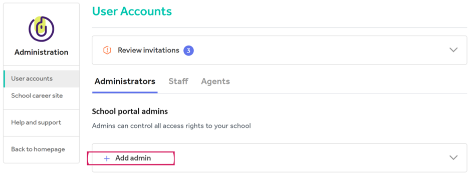 - Under user accounts, select which type of user you’d like to create an account for. Then select Add Administrator, Staff or Agent, and add the users’ work email address.
