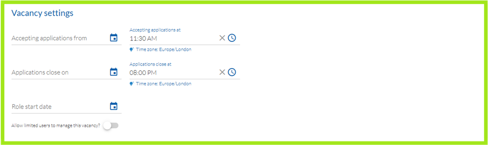 - Allow limited users to manage this vacancy: Toggle on this setting if you'd like users with Limited user permissions to view this vacancy.