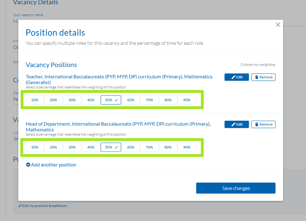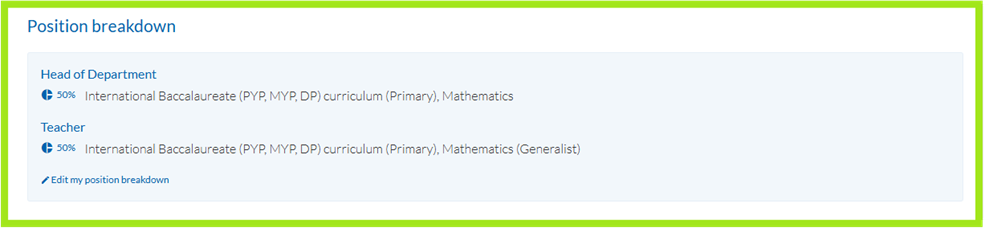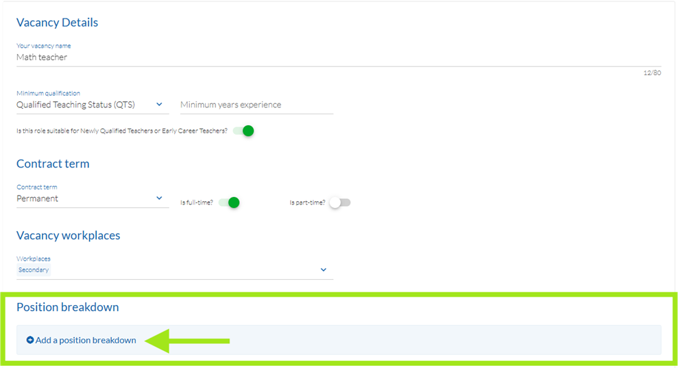 If the job has several roles or is a split position, you can Add a position breakdown to help job seekers understand what's required in this role. For example, you may need to recruit a Maths Teacher who is also a Head of Department 50% of the time.