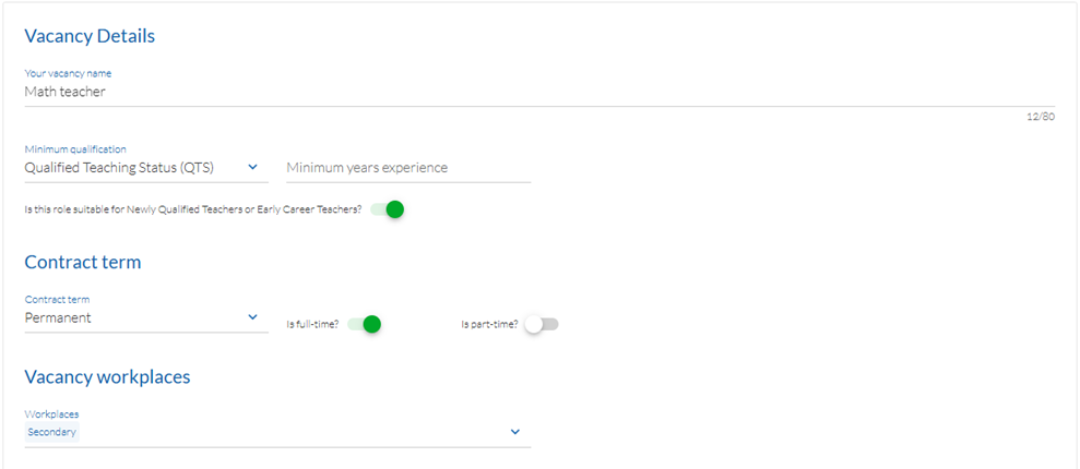 - Vacancy name: Use relevant keywords to describe the job so it's easy for candidates to search and find.