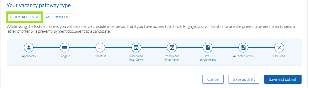 - 8-step pathway: You can make Longlists of promising candidates, Schedule interviews and document reference checks or send a Pre-employment letter before finalising recruitment.