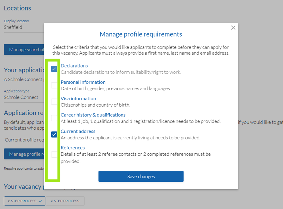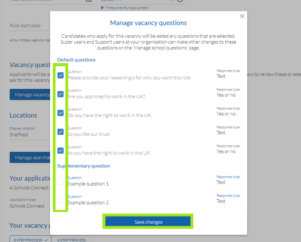 - Select the questions you would like to apply to this vacancy, then Save changes.
