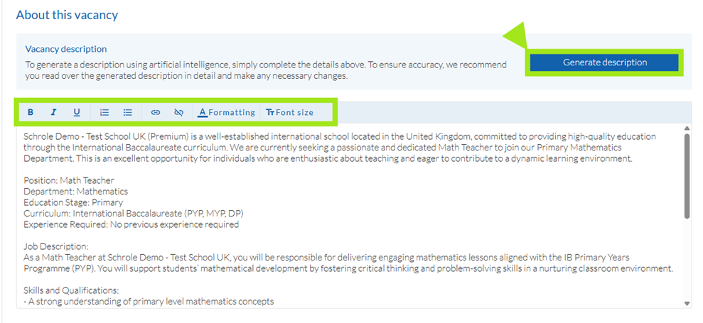 - Generate description: Will use the vacancy details you've provided to draft a job description outlining relevant skills, qualifications, values and attributes.
